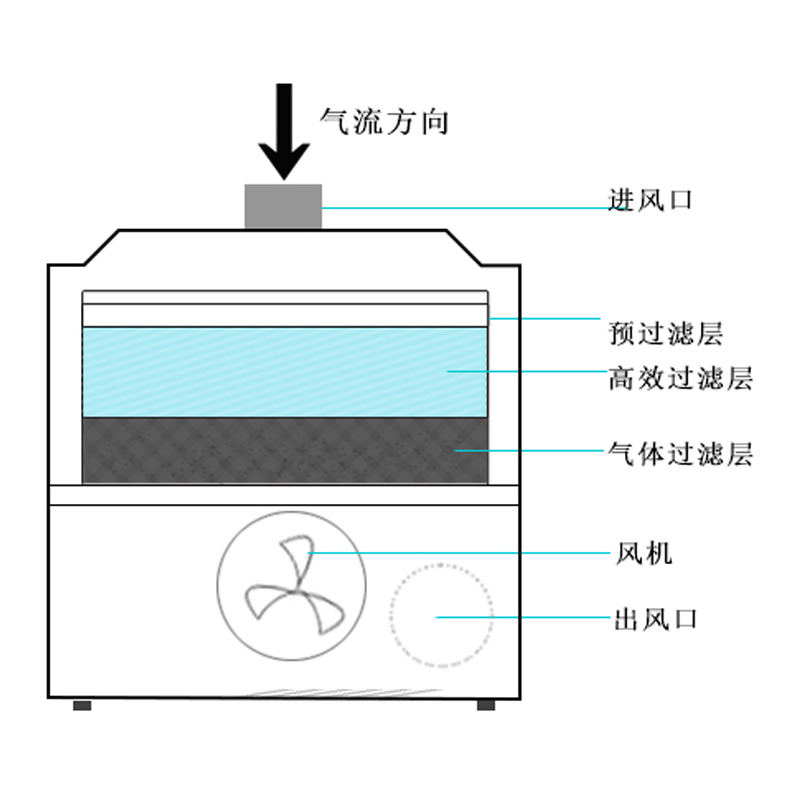 2.主過濾層過濾梯度設置:初中效過濾+HEPA高效過濾。凈化顆粒直