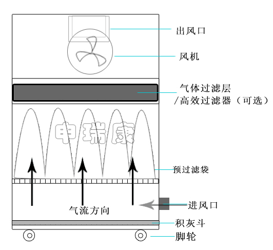 5.倒置進(jìn)風(fēng)設(shè)計(jì),袋式過濾,大顆粒粉塵會(huì)沉降至底部積灰斗,最大程度增加了容塵量。