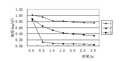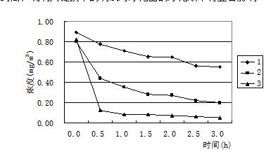 圖2 比較(圖2)中的三條凈化效率曲線可以看出,在相同的測試條件下,使用相同的技術(shù),但是凈化效率卻有很大差異,2號產(chǎn)品能使甲醛濃度迅速下降,1h內(nèi)即達到0.1mg/m3以下,可是1號產(chǎn)品在開啟3h后,甲醛濃度依舊在0.7mg/m3以上。許多研究表明,光催化可以在常溫常壓下即可將空氣中的有害氣體分解成無毒物質(zhì)[7],而且沒有二次污染,是一種有效的去除各種室內(nèi)污染物的先進技術(shù),但在我們測試的同時檢測環(huán)境艙內(nèi)的臭氧濃度,發(fā)現(xiàn)臭氧濃度在光催化技術(shù)的凈化器凈化過程中均有不同程度的升高。這說明在考慮選擇光催化凈化產(chǎn)品的同時,不應該忽視其副產(chǎn)物臭氧的存在。另外光催化產(chǎn)品還存在催化劑失活的現(xiàn)象。催化失活是指催化劑表面被反應產(chǎn)物或顆粒物覆蓋,失去催化效果,必須及時更換核心部件。因此如何選擇副產(chǎn)物的生成量較小,并且壽命較長的催化產(chǎn)品是催化劑類凈化器選型的關鍵。同一臺凈化機改進前后凈化效率的比較 由于同種技術(shù)的凈化效果會因為設計工藝或者制造技術(shù)的不同形成較大差異,所以很多凈化器廠家也在不停的改進生產(chǎn),希望可以得到效果好、副產(chǎn)物少、壽命長的產(chǎn)品。圖3中表示的是一家使用復合式技術(shù)廠家生產(chǎn)的凈化產(chǎn)品,主要采用的技術(shù)有過濾、吸附、高壓靜電和負離子,(圖1、2、3)中曲線分別是同一臺凈化器未經(jīng)過改進和兩次改進后得到的凈化效率曲線,三次試驗時凈化器內(nèi)部結(jié)構(gòu)基本相同,只是在關鍵技術(shù)處做出調(diào)整,測試時得出的凈化效率有明顯差異。從圖中可以清晰的看出,三條凈化效率曲線明顯由低到高,說明關鍵技術(shù)的調(diào)試對凈化器的凈化效率有顯著影響。